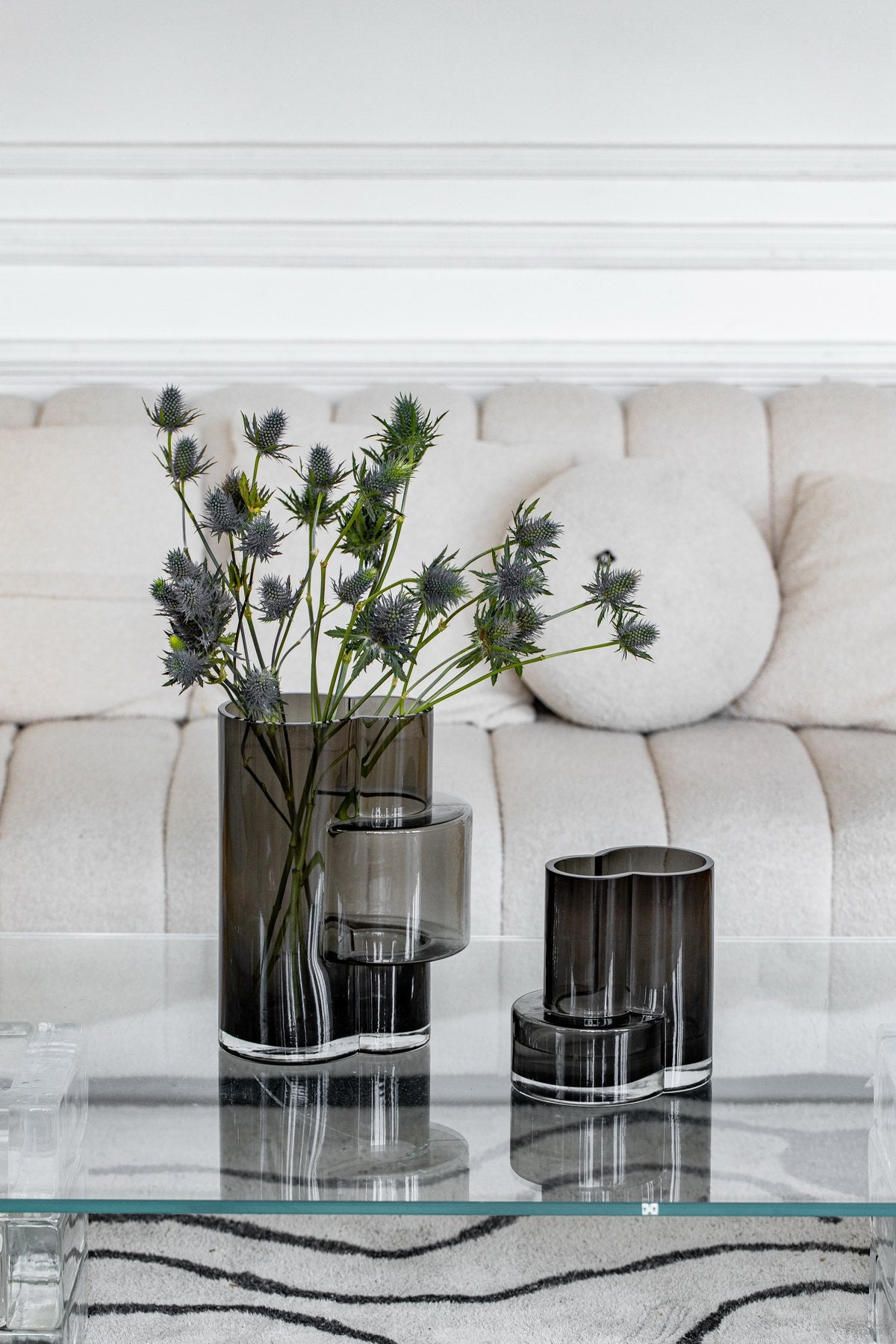Ontdek de tijdloze schoonheid van onze glazen zwarte vaas, een subliem stuk dat jouw bloemen en interieur naar een hoger niveau tilt. Met een hoogte van 32 cm biedt deze vaas een perfecte balans tussen subtiele elegantie en eigentijdse stijl. Zijn grijze design maakt het eenvoudig om de natuurlijke kleuren van je bloemen te laten stralen, waardoor elke ruimte een vleugje frisheid krijgt. Combineer deze vaas moeiteloos met onze andere moderne meubelstukken, zoals onze tafels, voor een samenhangend en chic interieur.