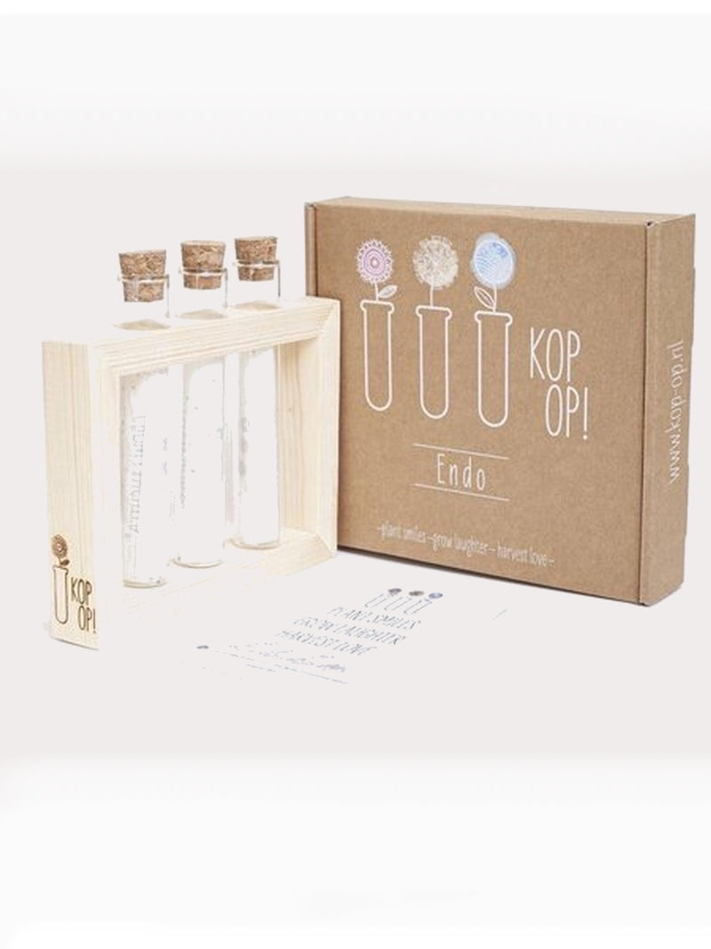 De 'E n d o' is een uniek, met liefde handgemaakt van vurenhout. Dit stijlvolle product bevat drie glazen reageerbuisjes, waarin ons speciale Kop Op! groeipapier zit. Het groeipapier bevat minimaal 100 zaadjes van veldbloemen, klaprozen of vergeet-me-nietjes. Deze zaadjes zorgen ervoor dat je lang kunt genieten van een bloeiend en kleurrijk cadeau. Bekijk ook onze andere potjes!